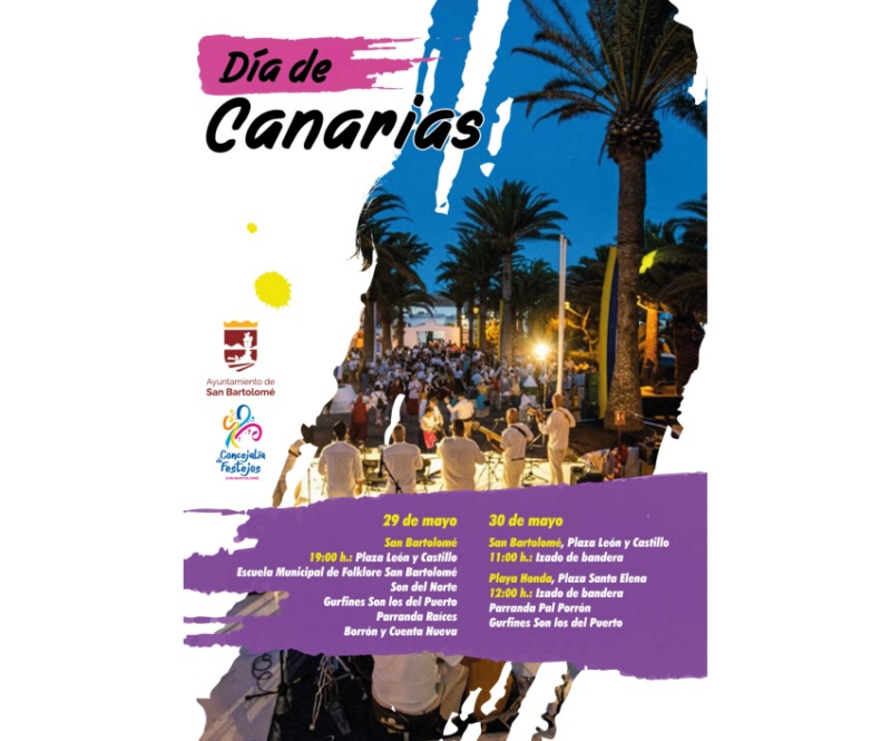 El martes 30 de mayo, Día de Canarias, comenzará a las 11:00 horas con el izado de bandera en la Plaza León y Castillo de San Bartolomé. Posteriormente, a las 12:00 horas, le tocará el turno a la Plaza de Santa Elena en Playa Honda, donde el izado de bandera estará acompañado por las actuaciones de la parranda Pa'l Porrón y Gurfines Son los del Puerto.