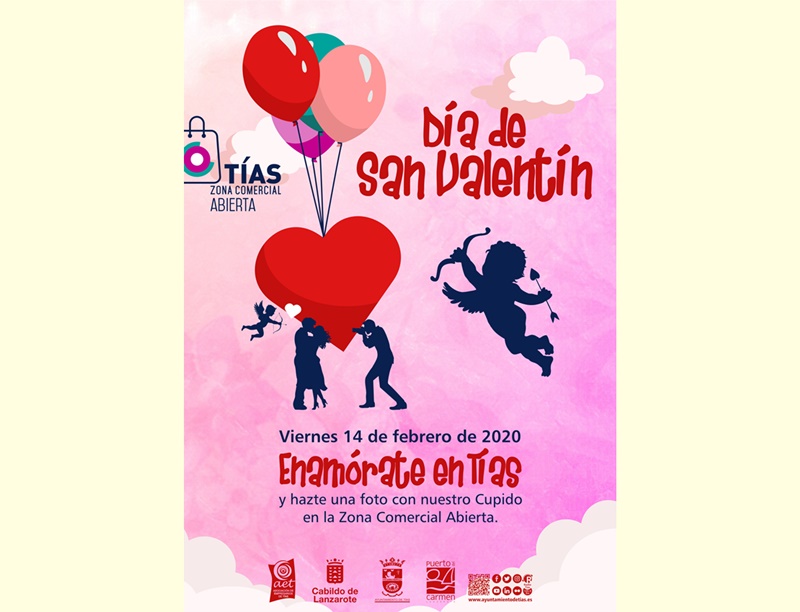 "Enamórate en Tías" es el lema que ha lanzado el Ayuntamiento de Tías y la Asociación de Empresarios de Tías (AET) por el día de San Valentín para dinamizar la zona comercial abierta del municipio, especialmente en el pueblo de Tías, donde Cupido se paseará el viernes en horario comercial ofreciendo sus mejores deseos a los viandantes.