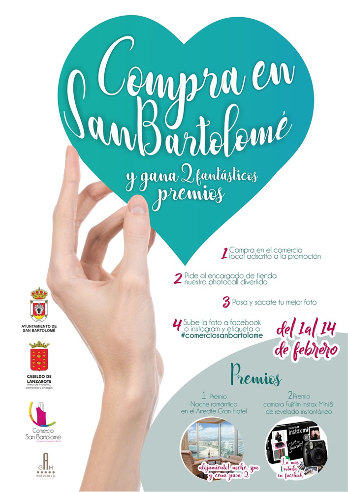 ¿Estás enamorado/a? ¿Tienes cerca a esa persona especial? Ya está muy próximo un día de pareja especial, porque no todos los días es 14 de febrero, Día de San Valentín. Por ello, en los comercios del municipio de San Bartolomé adheridos a la campaña podrás encontrar buenos regalos; esos regalos que enamoran. Además al realizar tus compras podrás participar en un concurso y obtener uno de los dos premios, un fin de semana romántico en el Arrecife Gran Hotel & SPA o una cámara de fotos instantánea Fujifilm!!