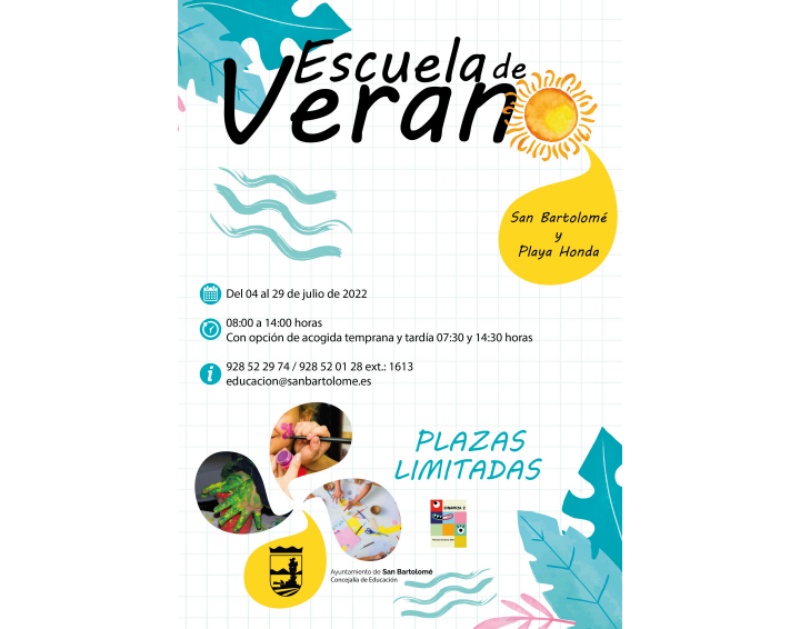 "El Ayuntamiento de San Bartolomé a través de la concejalía de Educación, delegada en Alma María González, organiza la Escuela de Verano informando a todas las personas interesadas que el plazo de inscripción comienza hoy 1 de junio, hasta cumplimentar las plazas, que son limitadas.