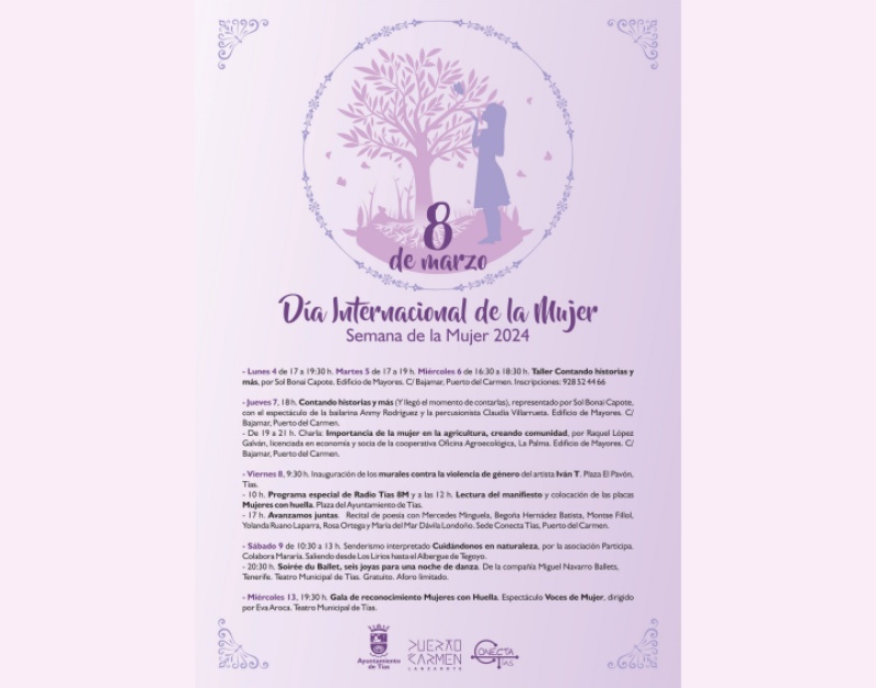 El Ayuntamiento de Tías celebra el Día Internacional de la Mujer con una completa programación de actos que se extenderá desde el 4 hasta el 13 de febrero en distintos espacios. Además de la lectura del manifiesto, previsto para el 8 de marzo a las 12 horas en la Plaza del Ayuntamiento, destaca la gala y acto de reconocimiento a Mujeres con Huella del municipio, que tendrá lugar el 13 de marzo en el Teatro Municipal.