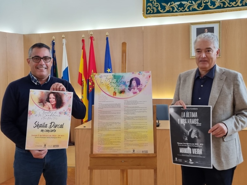 El alcalde, José Juan Cruz, y el concejal de Fiestas, Sergio García, presentaron hoy el cartel general de las fiestas de La Candelaria y San Blas y animaron a la ciudadanía a participar en los actos, que están dirigidos a todos los públicos con pasacalles, fritura, carrera nocturna, luchada, espectáculos infantiles, romería, folclore y actos religiosos.