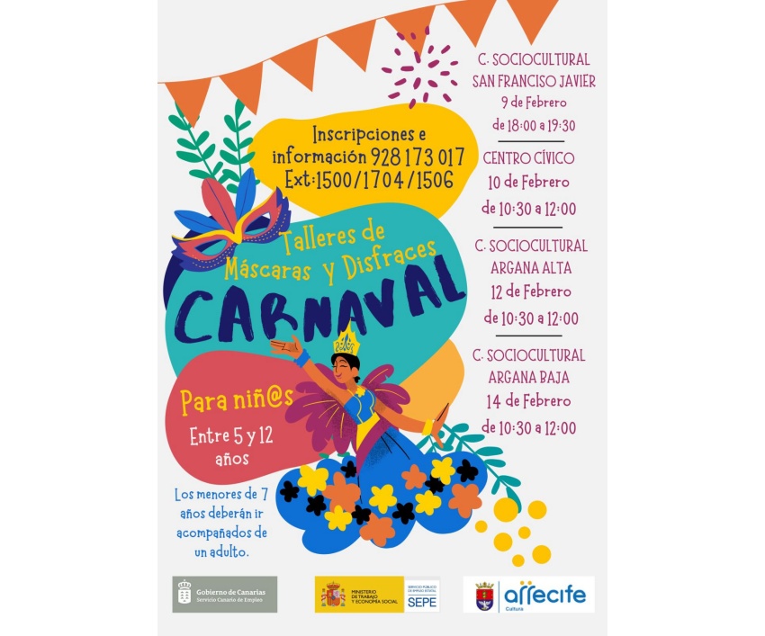 Y para contribuir a infundir el espíritu de estas fiestas entre chinijas y chinijos de cada casa, el Ayuntamiento de Arrecife que preside el alcalde Yonathan de León Machín, a través de la Concejalía de Cultura dirigida por Abigail González, organiza una serie de talleres infantiles de máscaras y disfraces en barrios del municipio.