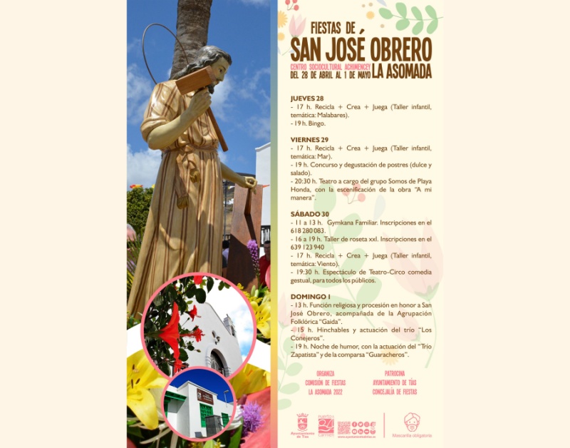 El Ayuntamiento de Tías, gobernado por PSOE, Lanzarote Avanza y Podemos Tías, anima a la población a participar en las fiestas de La Asomada en honor a San José Obrero que tendrán lugar en el centro sociocultural Achimencey a partir del próximo jueves, 28 de abril, hasta el domingo, 1 de mayo, día de la fiesta litúrgica.
