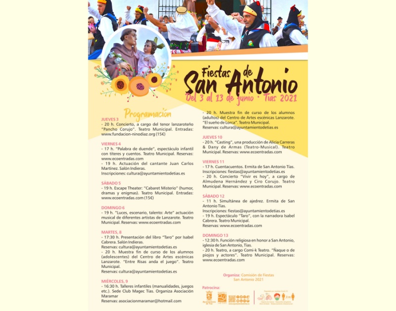 Las actividades en honor a San Antonio, organizadas por la comisión de fiestas y patrocinadas por el Ayuntamiento de Tías, comienzan el próximo jueves con un concierto a cargo del tenor lanzaroteño Pancho Corujo y continúan hasta el 13 de junio, día del patrón, con teatro, musicales, cuentacuentos, talleres, presentación de libro y conciertos.