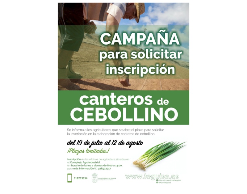 El área de Agricultura de Teguise informa que, desde este lunes, 19 de julio, y hasta el 12 de agosto, estará abierto el plazo para la inscripción para la elaboración de canteros de cebollino.