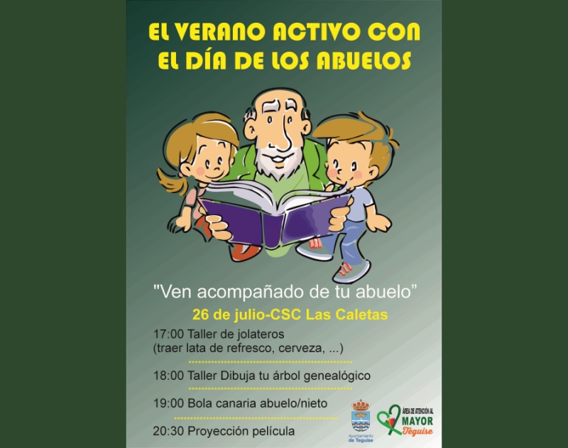De este modo, para el Día del Abuelo se desarrollarán a partir de las 17.00 horas un taller de jolateros con latas de refrescos que los niños deberán traer de casa, a las 18.00 horas se dibujará un árbol genealógico para promover el conocimiento de antepasados y descendientes, a las 19.00 horas abuelos y nietos jugarán juntos a la bola canaria, y por último, a las 20.30 horas se proyectará una película a modo de cine de verano.