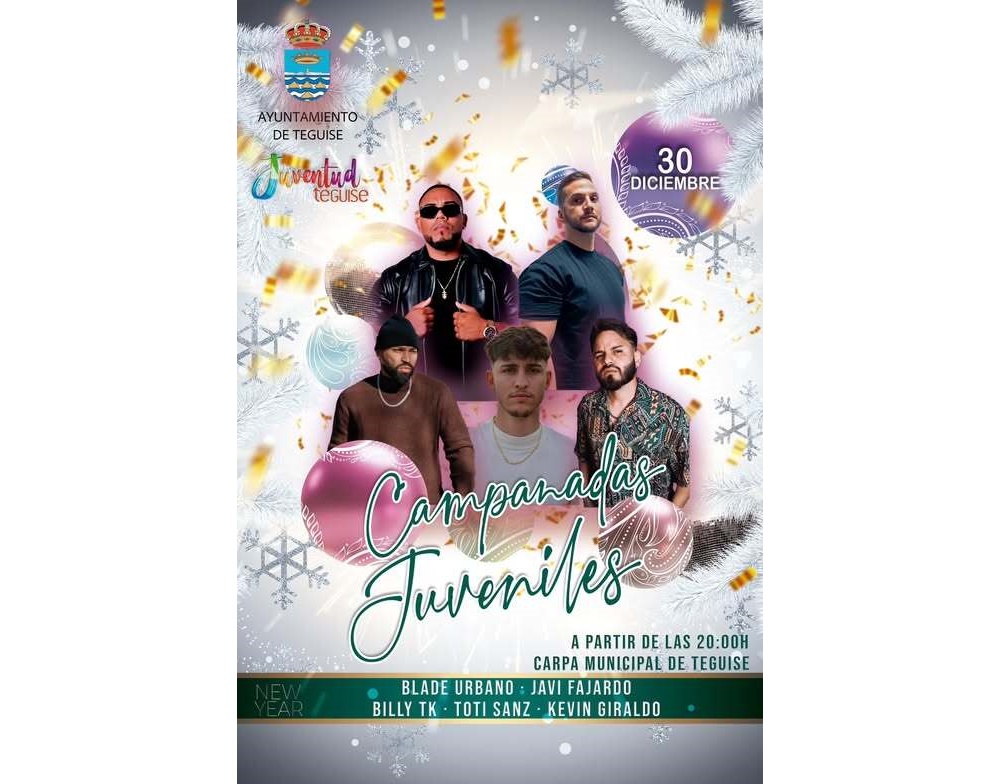 El Ayuntamiento de Teguise da la bienvenida anticipada al Año Nuevo con las Campanadas Juveniles. Un evento que se celebrará en la carpa municipal de la Villa de Teguise el próximo lunes, 30 de diciembre, a partir de las 20:00 horas, con la mejor música urbana y un ambiente festivo, dedicado a la juventud del municipio.