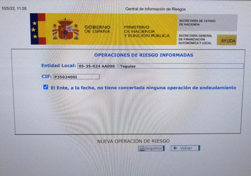 El Ministerio de Hacienda y Función Pública del Estado ratifica la deuda cero de Teguise con entidades bancarias después de que el Ayuntamiento hiciera frente a los 22 millones de euros de obligaciones financieras que tenía el Consistorio hasta el año 2011.