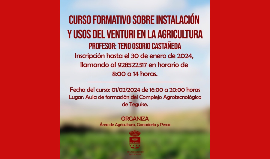 El Ayuntamiento de Teguise, a través del Área de Agricultura, Ganadería y Pesca del Ayuntamiento de Teguise, que dirige la alcaldesa Olivia Duque, ha organizado el curso formativo sobre 'Instalación y usos del venturi en la agricultura', dirigido por el profesor Teno Osorio Castañeda, docente en el IES Teguise.