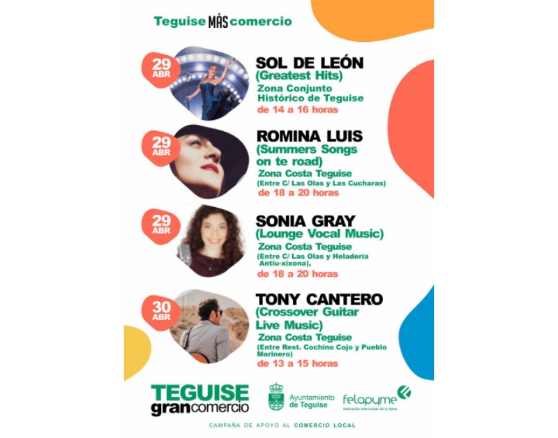 La agenda de dinamización comercial arranca este viernes 29 de abril de 14 a 16 horas en el Conjunto Histórico de La Villa con la actuación de la cantante Sol de León. Y entre las 18 y las 20 horas, Romina Luis aportará música en Costa Teguise, en la zona entre la calle Las Olas y Las Cucharas de Costa Teguise; y Sonia Gray entre la calle Las Olas y la heladería Antiu Xixona. El sábado 30 de abril, el cantante Tony Cantero estará también en Costa Teguise, en la zona del Pueblo Marinero entre las 13 y las 15 horas.