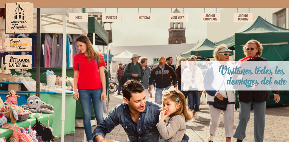 INICIO: En la parte superior, un slider con fotografías cedidas por el Ayuntamiento. En la parte central izquierda, una breve bienvenida explicando a los usuarios cuándo, dónde y a qué hora pueden visitar el Mercadillo y qué se van a encontrar, no dejando atrás la oportunidad de visitar el municipio de lunes a sábado y apreciar los encantos de la Villa. En la parte izquierda, un mapa de la Villa de Teguise, donde pinchar y abrir el mapa para verlo en su totalidad. Y en la parte baja izquierda, una breve descripción de la historia del Mercadillo, resaltando las características más relevantes de la misma.
