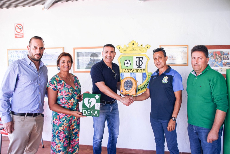 El Ayuntamiento de Teguise continúa dotando de modernas unidades de cardioprotección al municipio. En esta ocasión, el alcalde de Teguise, Oswaldo Betancort, acompañado por los ediles Olivia Duque y Gerardo Rodríguez, ha hecho entrega de una nueva unidad a la directiva del Club Deportivo Tahíche, que cuenta ya con una herramienta esencial para salvar vidas en caso de emergencias.