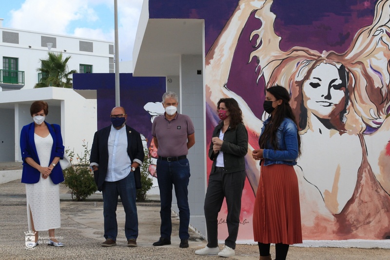 La directora del Instituto Canario de Igualdad (ICI), Kika Fumero, y el alcalde de Tías, José Juan Cruz, acompañados del concejal de Igualdad y Diversidad, Nicolás Saavedra, y la concejala de Cultura, Pepa González, inauguraron los murales, que invitan a reflexionar sobre la violencia estética contra las mujeres.