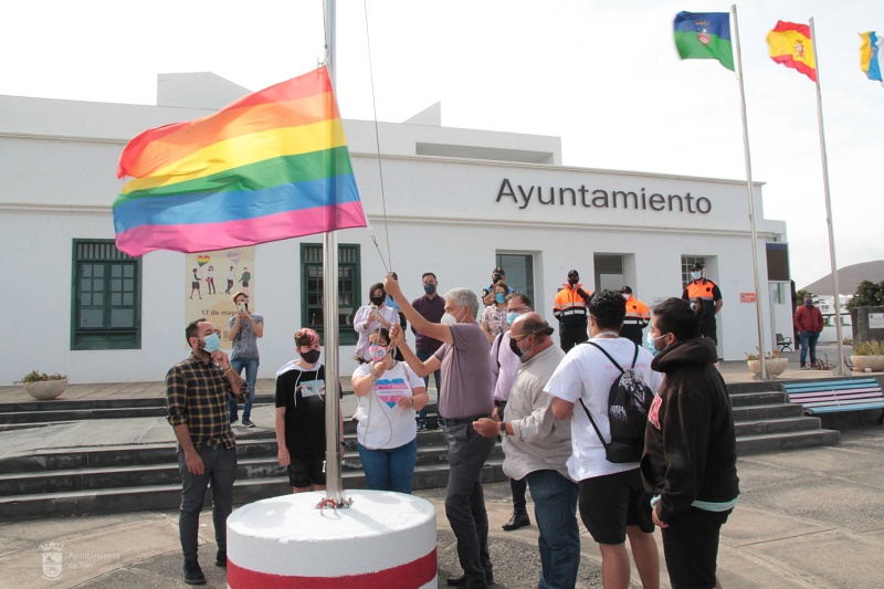 El Ayuntamiento de Tías conmemoró ayer el Día Internacional contra la Homofobia, Transfobia y la Bifobia con un acto de izado de bandera en la Plaza del Ayuntamiento y lectura de un manifiesto por parte de un integrante de la asociación de familias menores trans, Chrysallis.