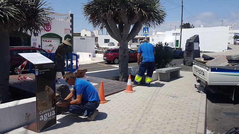 En estas semanas atrás operarios del Ayuntamiento de Tías han realizado los trabajos de embellecimiento de la zona donde, desde ahora, está erigida esta escultura que recuerda la llegada y almacenamiento del agua al centro de Tías, en aquellas décadas pueblo que vivía de la actividad agrícola vinculada a los cultivos de los tomates y cebollas.