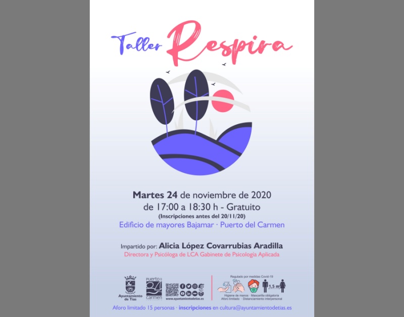 El Ayuntamiento de Tías ha organizado un taller gratuito de relajación para personas mayores denominado "Respira". El taller será impartido por la psicóloga Alicia López Covarrubias el martes, 24 de noviembre, de 17:00 a 18:30 horas en el centro de Mayores de la calle Bajamar, en Puerto del Carmen.