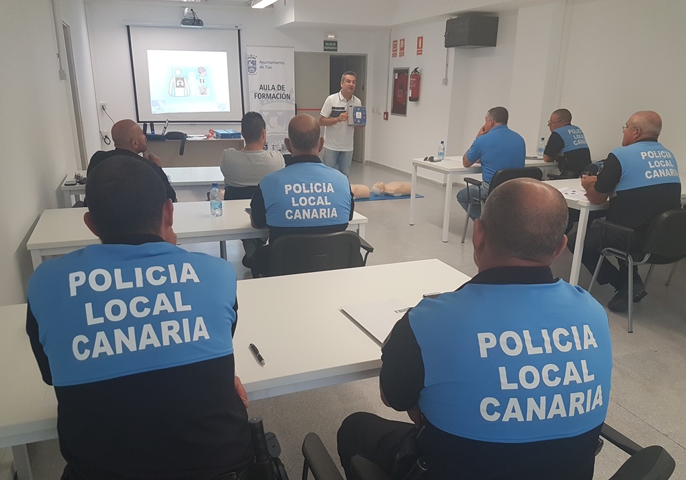 El Ayuntamiento de Tías inició este martes un curso específico para formar a toda la plantilla de la Policía Local en el uso de aparatos desfibriladores. La formación se realiza, a petición del Ayuntamiento, por la Dirección General de Seguridad y Emergencias del Gobierno de Canarias que emitirá las preceptivas acreditaciones a los agentes asistentes a los cursos. El alcalde de Tías, Pancho Hernández, ha destacado que "el objetivo es aportar los conocimientos y las destrezas necesarias para poder realizar una primera atención de la parada cardíaca hasta el momento de la llegada de los equipos especializados". Para eso, el Cuerpo de la Policía Local de Tías ya dispone de un aparato desfibrilador, cedido por el Consorcio de Seguridad y Emergencias de Lanzarote. Desde el Ayuntamiento de Tías, avanzó el acalde , se prevé seguir dotando a la nueva flota que se incorporará próximamente con nuevos equipos DEA (Desfibrilador Externo Automático (DEA) y de manera previa se está formando a toda la plantilla de la Policía Local con cursos teóricos y prácticos en el uso de desfibrilador.