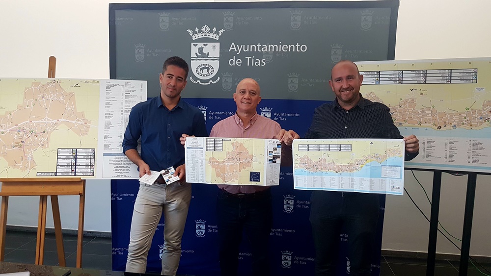 El alcalde de Tías, Pancho Hernández, acompañado por el teniente de alcalde y concejal de Turismo y Cultura Amado Jesús Vizcaíno, y Carlos Cabrera, en representación del Grupo Cabrera Medina, han dado a conocer las características de estos nuevos callejeros que presenta un diseño actualizado que - a diferencia de otros anteriores planos- utiliza cartografía donde se muestra la información municipal en iconos y por rutas, entre ellas los diferentes senderos turísticos.