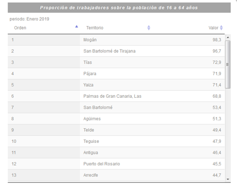 Mogán, con el 98,3 % de su población en edad de trabajar, lidera este ranking. San Bartolomé de Tirajana se sitúa en el 96,7 y Tías, en tercera posición, con el 72,9%. San Bartolomé, en Lanzarote, está en séptima posición con el 53,4 %. Teguise, en el décimo, con 47,9 % y Arrecife, la capital de Lanzarote, en la décimo tercera posición, con el 44,7 % de su población entre los 16 y 64 años edad.