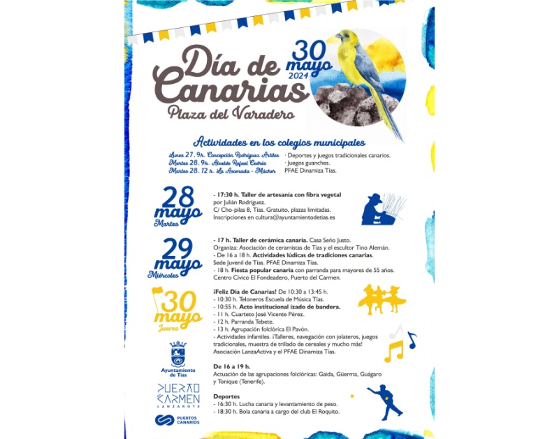 El Ayuntamiento de Tías ha preparado un completo programa para celebrar el Día de Canarias con deportes y juegos tradicionales canarios, parrandas, talleres y conciertos desde el 27 hasta el 30 de mayo en diferentes localizaciones, desde los colegios del municipio pasando por la Casa Seño Justo, el Espacio Joven de Tías, El Fondeadero y la plaza del Varadero.