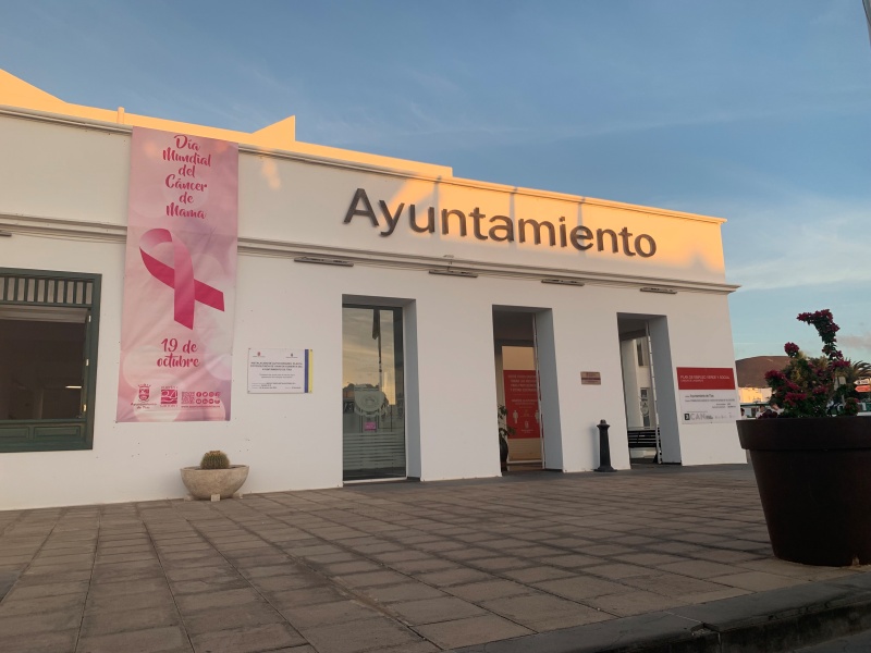 El Ayuntamiento de Tías se suma a la celebración hoy del Día Mundial de la Lucha contra el Cáncer de Mama como recordatorio del compromiso de la toda la sociedad en la batalla contra esta enfermedad. Una gran lona de color rosa se muestra en la fachada del Ayuntamiento para visibilizar este día.