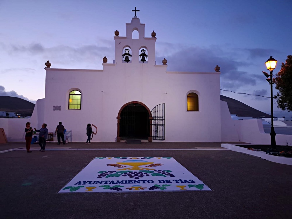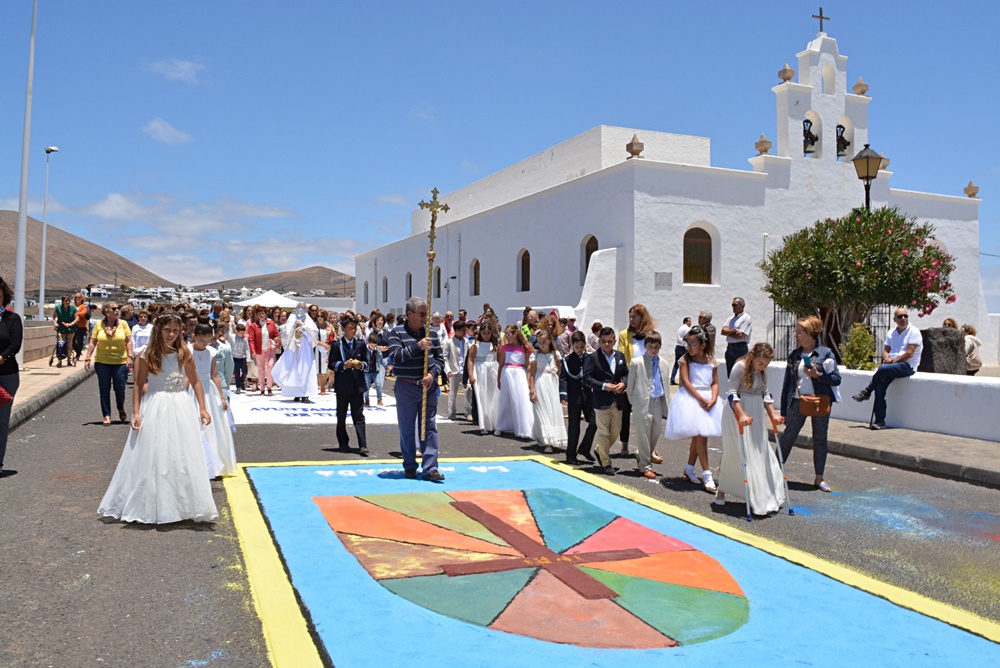 La tradición por el Día del Corpus volvió este pasado fin de semana a las calles del pueblo de Tías. Los colectivos culturales, deportivos, vecinales, parroquiales y el Ayuntamiento de Tías se han unido, un nuevo año, a esta tradición preservando la confección de las coloridas alfombras con sal. Pese a que fueron