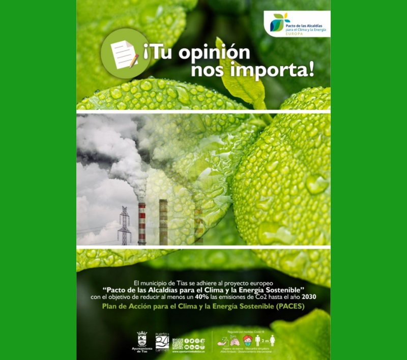 El equipo de gobierno del Ayuntamiento de Tías, formado por PSOE, Lanzarote Avanza (LAPA) y Lanzarote en Pie-Sí Podemos, anima a la población a participar en la encuesta disponible en la página web del Ayuntamiento para preparar el Plan de Acción para el Clima y la Energía Sostenible (PACES).