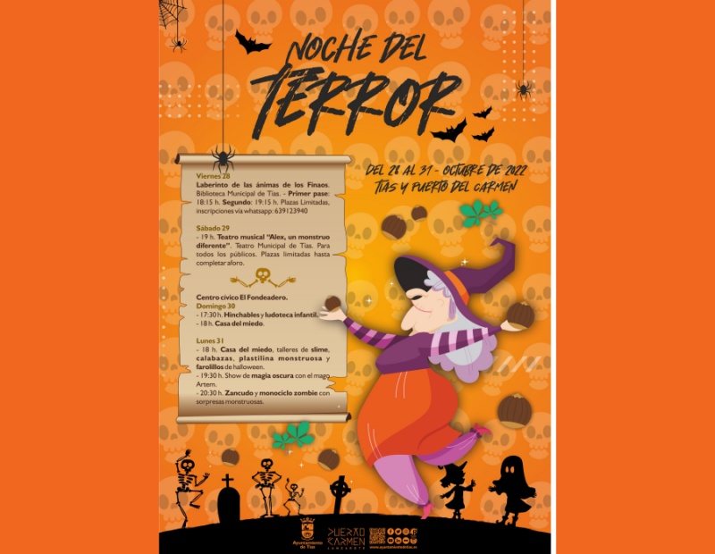 Las "Noches del Terror" llegan al municipio de Tías con una programación de actos que se desarrollarán desde el viernes, 28 de octubre, hasta el lunes, 31 de octubre, en distintos espacios de Tías y Puerto del Carmen. Destacan las recreaciones de La Casa del Miedo, talleres, show de magia, zancudo, sorpresas monstruosas, hinchables y ludoteca infantil.