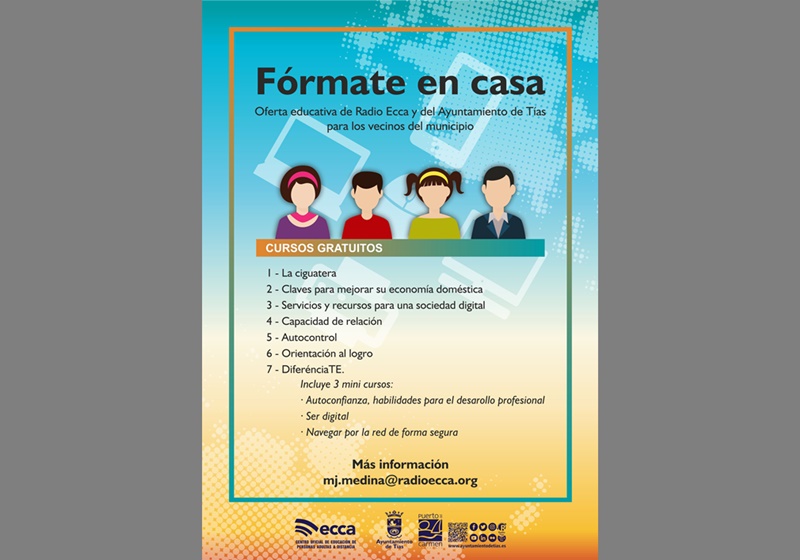 El Ayuntamiento de Tías y la Fundación Radio Ecca lanzan una nueva campaña de oferta educativa gratuita para los vecinos y vecinas del municipio. "Fórmate en casa" es una iniciativa que se suma a la docena de cursos ofertados a principios de abril y que aporta nuevo material con contenido relacionado con el mundo digital, el desarrollo profesional, la autoconfianza y la ciguatera, entre otros.