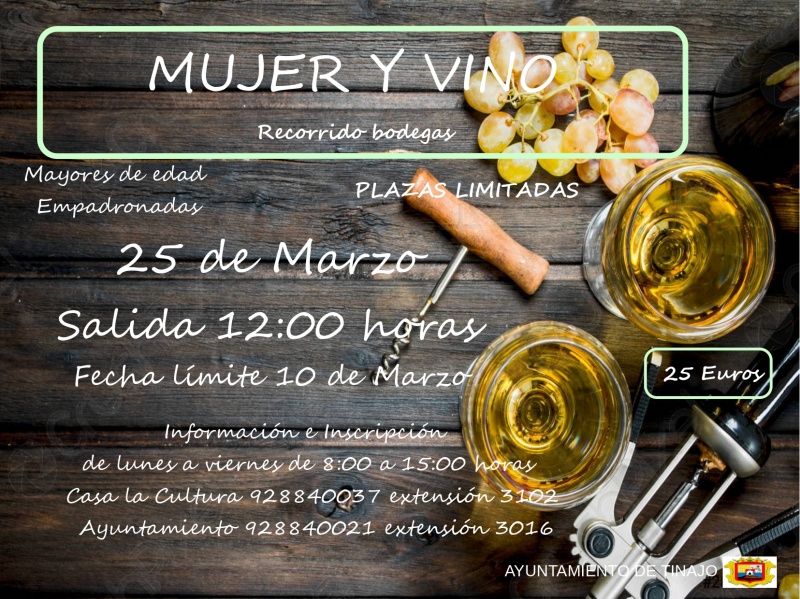 La Concejalía de Igualdad del Ayuntamiento de Tinajo llevará a cabo el próximo 25 de marzo una visita a las bodegas de la isla para ver de primera mano su funcionamiento y degustar sus excelentes vinos. La actividad está dirigida a las mujeres empadronadas en el municipio y se enmarca dentro de los eventos que el consistorio celebrará durante el mes de marzo para conmemorar el Día Internacional de la Mujer.