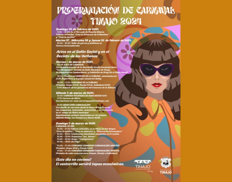 Ya está todo dispuesto en Tinajo para disfrutar, un año más, del Carnaval. El Carnaval de Tinajo 2024, bajo la alegoría de “Los Años 60”, se celebrará los días 1, 2, y 3 de marzo de 2024 con actos en el Salón Social y en el recinto de las verbenas.