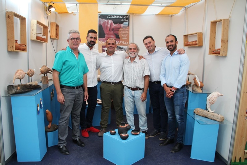 El alcalde Yaiza, Óscar Noda, el primer teniente de alcalde, Ángel Domínguez, y los concejales Javier Camacho, Emilio Machín y Daniel Medina visitaron el rincón de 'Cerámica Uga' en Macha Blanca tras el acto de apertura oficial de la Feria.
