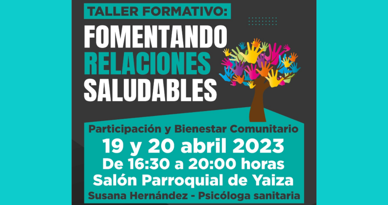 El Ayuntamiento de Yaiza invita a vecinos y vecinas a participar del taller formativo sobre relaciones saludables organizado en dos jornadas en el salón parroquial de Yaiza, situado al lado de la Plaza de Remedios, los días miércoles 18 y jueves 19 de abril en horario de tarde, de 16:30 a 20:00 horas, impartido por la psicóloga sanitaria Susana Hernández, iniciativa que forma parte del programa de actividades formativas del Área de Participación y Bienestar Comunitario que dirige la concejala Águeda Cedrés.