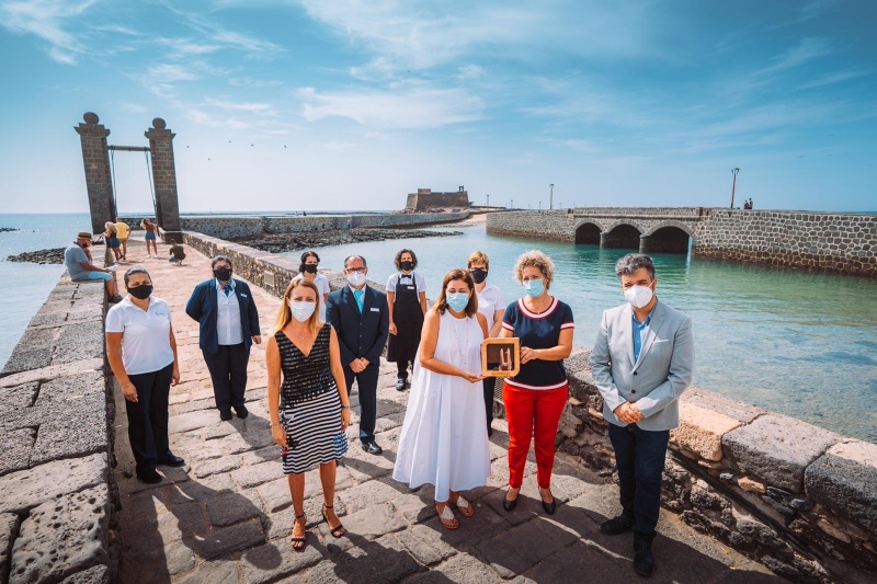 La entrega ha tenido lugar en las instalaciones del hotel, ubicado en primera línea junto al Puente de las Bolas- símbolo de Arrecife- en un acto ceñido a los protocolos a seguir por la actual situación del covid 19. La alcaldesa de Arrecife, Astrid Pérez, y el concejal de Turismo, hicieron entrega de este reconocimiento a la representante de la propiedad, la familia conejera Medina, Celsa Medina, y a la directora del Hotel Miramar, Mercedes Medina. Una representación de los trabajadores de este emblemático hotel asistió a este acto.