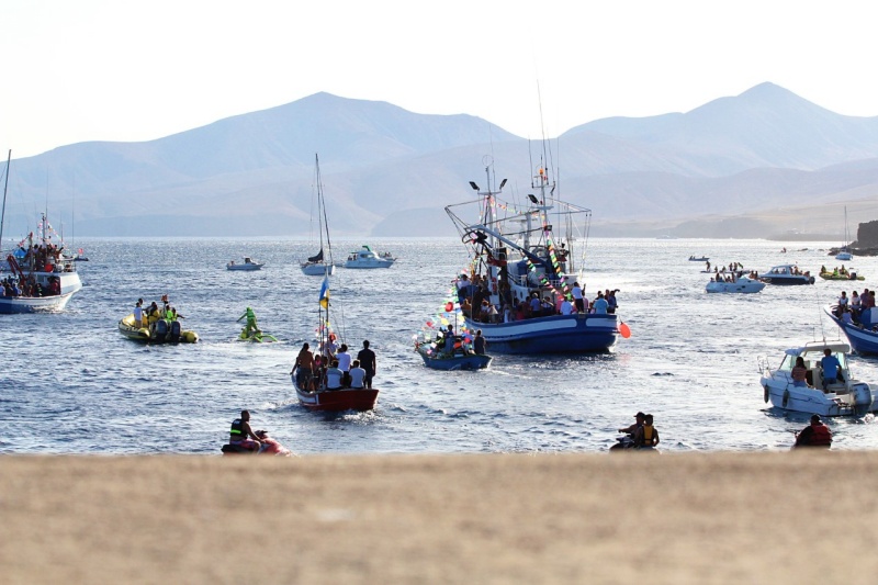 La procesión marítima de Puerto del Carmen surca la aguas de esta zona turística con decenas de embarcaciones de pesca y de recreo para acompañar a la Virgen por la costa del Risco, barranco del Quíquere y Playa Grande, zarpando desde el puerto de la Tiñosa.