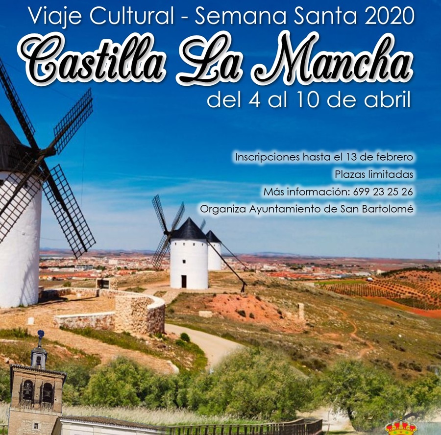 El Ayuntamiento de San Bartolomé ha organizado un viaje cultural a Castilla La Mancha. Aquellos vecinos/as interesados en disfrutar del mismo podrán hacerlo a través del viaje organizado por el Ayuntamiento de San Bartolomé a Castilla la Mancha en Semana Santa del 4 al 10 de abril.