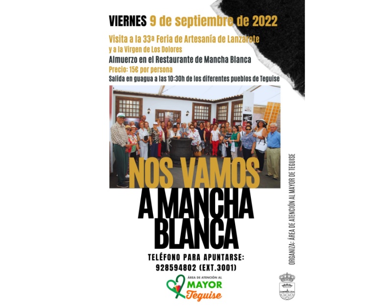 El próximo viernes, 9 de septiembre, saldrán guaguas desde las 10.30 horas de la mañana y desde distintos puntos del municipio de Teguise hacia Tinajo. "Nos gustaría visitar la feria, con parada especial en el stand de Teguise y luego visitar también a la Virgen de Los Dolores en la ermita y terminar la jornada almorzando juntos en el restaurante de Mancha Blanca", ha explicado Nori Machín como concejala del Área del Mayor. Los/as interesados/as deben llamar al teléfono 928 59 48 02 (extensión 3001).