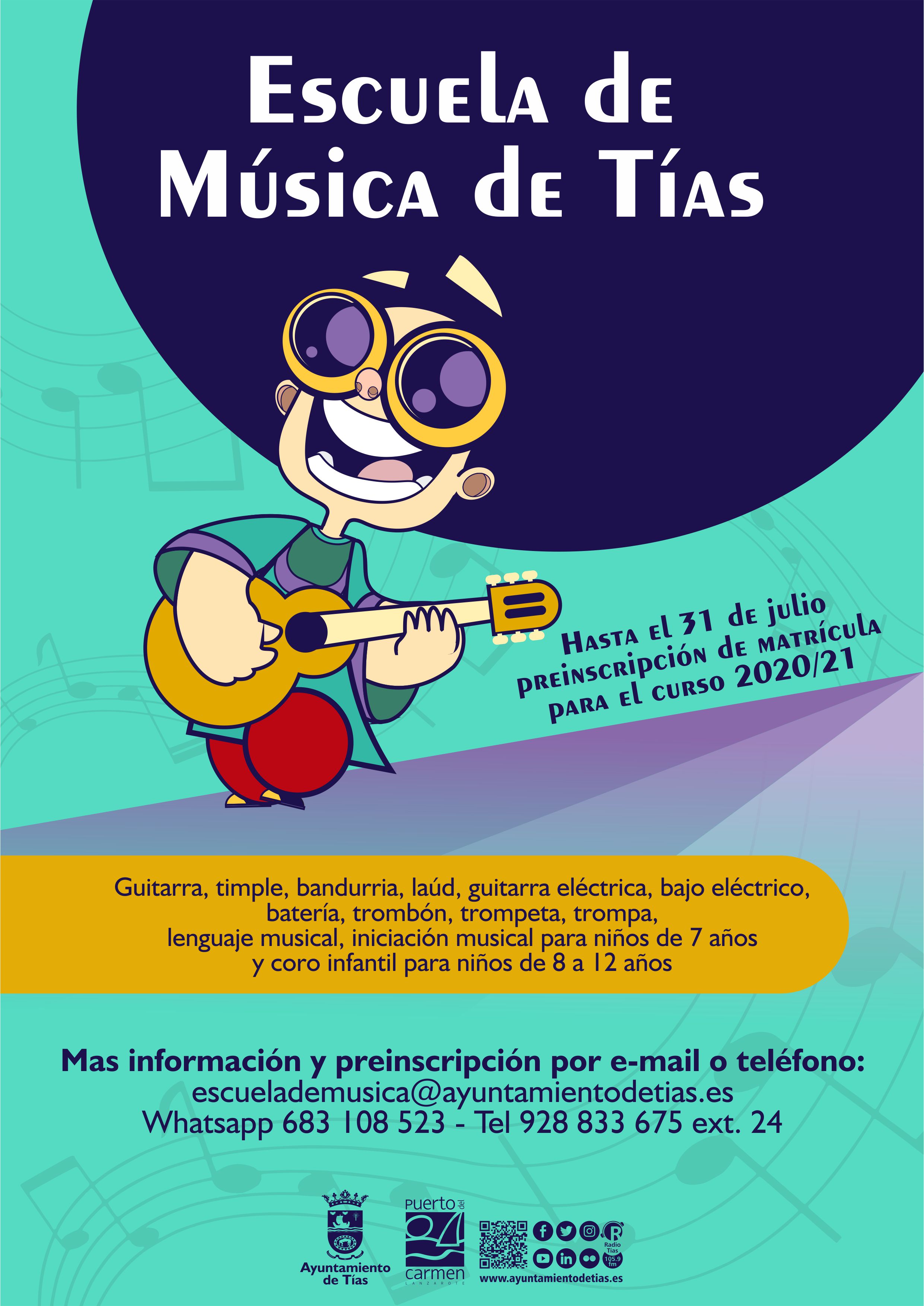 La Escuela de Música de Tías abre el periodo de preinscripción para el curso 2020/2021, cuyo plazo finalizará el 31 de julio. Las clases, que están destinadas a un alumnado sin límite de edad, se impartirán a partir de septiembre en las instalaciones del Edificio de Usos Múltiples del Ayuntamiento.