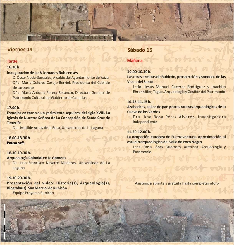 El encuentro se desarrollará el viernes 14 y el sábado 15 de abril, con un programa completo que se puede consultarse en www.yaiza.es, y se enmarca en el proyecto de investigación arqueológica en el yacimiento de San Marcial de Rubicón, desarrollado al amparo del convenio de colaboración suscrito entre el Gobierno de Canarias, el Ayuntamiento de Yaiza y las dos universidades públicas del Archipiélago, la Universidad de Las Palmas de Gran Canaria y la Universidad de La Laguna.