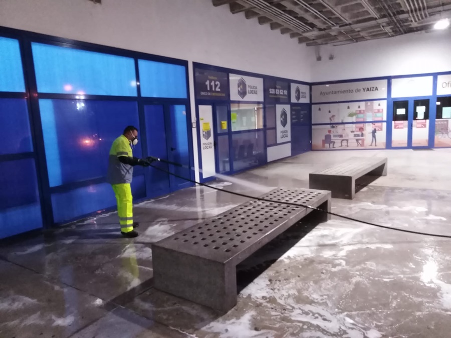 El Ayuntamiento de Yaiza encargó a la empresa de limpieza Urbaser la desinfección de lugares públicos del municipio que por obvias razones aunque en estos días de estado de alarma son visitados por vecinos y vecinas como pueden ser centros de salud, supermercados, minimercados, farmacias, oficina de Servicios Sociales, paradas de taxias, paradas de guaguas de las distintas localidades de Yaiza y la Estación de Guaguas de Playa Blanca, donde además funciona la Policía Local de Yaiza.