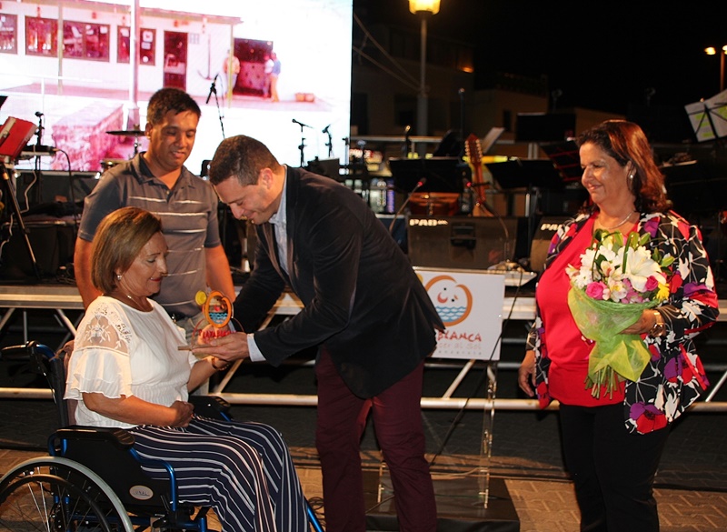 Arropada por familiares, entre ellos, su marido Gregorio y sus hijos Manuel y Álvaro, amigos entrañables de Playa Blanca, concejales del gobierno municipal de Yaiza, y vecinos y visitantes de la localidad, María Victoria recibió la distinción de manos del alcalde, Óscar Noda, y de la concejala de Turismo, Olga Caraballo.