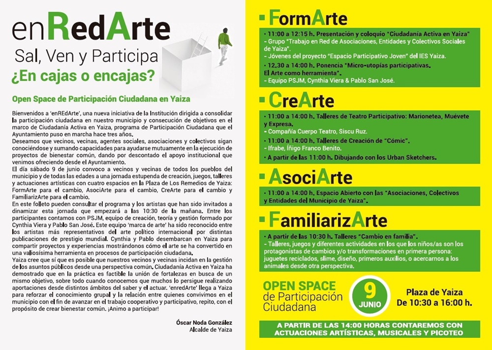 El Ayuntamiento de Yaiza invita a vecinos, vecinas, colectivos y asociaciones del municipio y Lanzarote a vivir este sábado 9 de junio, de 10:30 a 16:00 horas, una nueva e interesante jornada de integración y participación ciudadana señalada por el intercambio de experiencias y la creación. 'EnRedArte' propone un día de juegos, mesas redondas, talleres y actuaciones artísticas en cuatro espacios con actividad simultánea, en la Plaza de Los Remedios del pueblo de Yaiza.