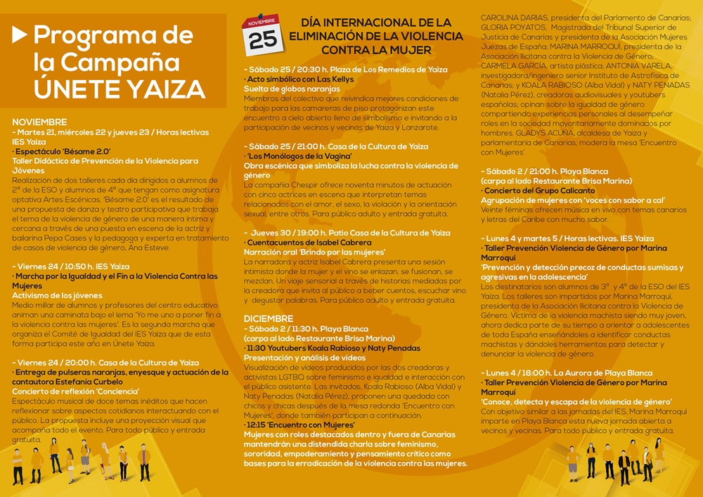 El Ayuntamiento de Yaiza reafirma su compromiso con la lucha contra la violencia machista sumándose a los días naranjas de activismo mundial promovidos por Naciones Unidas que adoptan nombre propio en Lanzarote: Únete Yaiza, campaña que entre el 21 de noviembre y el 5 de diciembre ofrece talleres pedagógicos, artes escénicas y música para orientar, prevenir y reflexionar sobre la violencia a mujeres niñas. El programa completo de actividades, publicado en portada de www.yaiza.es, prevé eventos en el IES Yaiza dirigidos a estudiantes y otros abiertos al público en localizaciones de Yaiza y Playa Blanca.