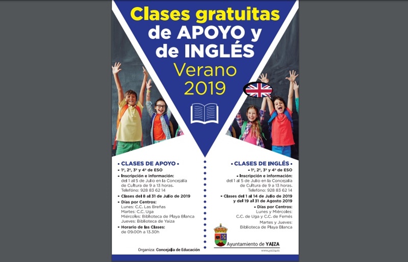 Las Áreas de Educación y Cultura del Ayuntamiento de Yaiza, dirigidas por Silvia Santana y Daniel Medina, respectivamente, han organizado para este verano de 2019 clases gratuitas de apoyo escolar y de inglés para los alumnos de 1º, 2º, 3º y 4º de ESO, que se impartirán en los pueblos de Yaiza, Uga, Femés, Las Breñas y Playa Blanca.
