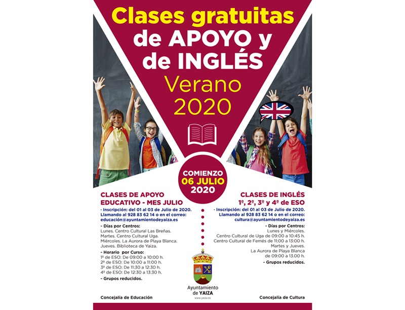 Las familias de Yaiza pueden inscribir ya a chicos y chicas que cursen 1º a 4º de la ESO en las clases de inglés y de apoyo educativo que empezarán el próximo 6 de julio en los centros culturales del municipio, cumpliendo con las medidas de prevención y seguridad sanitaria, siendo obligatorio el uso de mascarilla. Las clases de inglés están previstas durante los meses de julio y agosto y las de apoyo escolar durante julio.