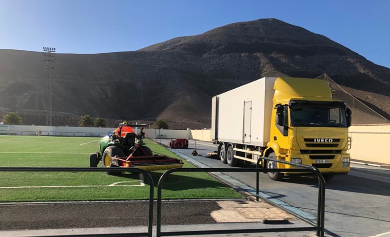 El Ayuntamiento de Yaiza ejecuta esta semana trabajos de mantenimiento preventivo en el área de juego del campo de fútbol municipal consistente en la limpieza, desinfección y descompactación del césped artificial cumpliendo con la normativa técnica recomendada para este tipo de pavimento. El concejal de Deportes de Yaiza, Ángel Lago, anota que "el riego de la superficie es importante pero también lo son acciones complementarias que requieren la intervención de personal y maquinaria especializada como la que ahora trabaja en nuestro campo municipal".