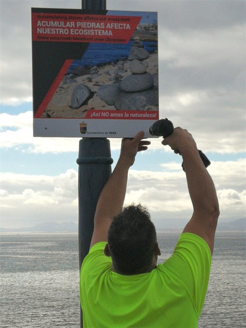 El Ayuntamiento de Yaiza ha puesto en marcha una nueva campaña para la conservación del paisaje instalando carteles en varias zonas costeras del paseo marítimo de Playa Blanca que informan sobre el daño que produce al ecosistema y medio ambiente acciones aparentemente inofensivas como acumular piedras para hacer "esculturas" o utilizarlas para formar nombres y figuras en la playa como sucede en la playa de Las Coloradas, entre otros parajes sureños.