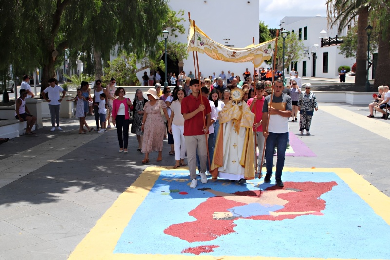 Todo el esfuerzo de la jornada creativa del sábado en la Plaza de Los Remedios cobró mayor sentido en la procesión que secundó la Eucaristía de este domingo 11 de junio con la que fieles y acompañantes conmemoraron la tradicional festividad de la Iglesia Católica del Corpus Christi, adornada en el pueblo de Yaiza por el diseño y colorido de las alfombras de sal.