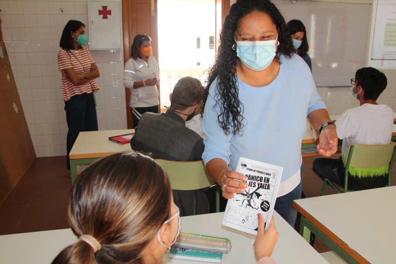 La concejala de Participación Ciudadana de Yaiza, Águeda Cedrés, hizo entrega este lunes de 150 ejemplares de los cómics al alumnado en compañía de la vicedirectora del IES, Ariadna Herrera, y de la coordinadora del Eje de Familia y Participación, Sandra Santana.